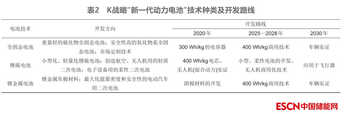 圍繞下一代動(dòng)力電池技術(shù),韓國政府將拉動(dòng)公私合作,支持大規(guī)模電池研發(fā)。K戰(zhàn)略中,韓國政府對(duì)研發(fā)路線進(jìn)行了規(guī)劃,主要圍繞新一代電池制造技術(shù)以及實(shí)現(xiàn)全固態(tài)電池、鋰硫電池、鋰金屬電池的商用化,如表2所示。