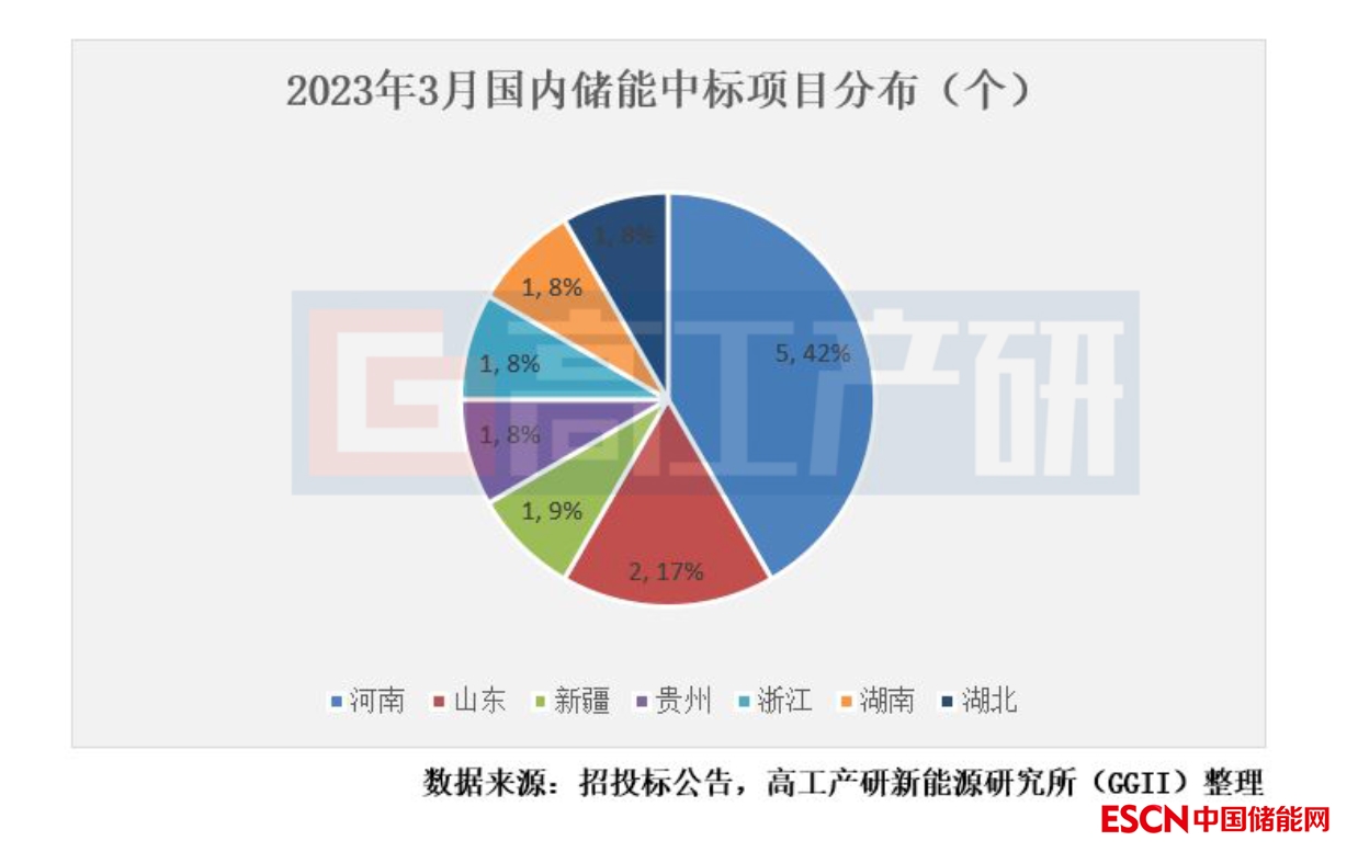 3月儲能中標(biāo)項目主要分布在河南、山東兩省,占據(jù)本月一半數(shù)目,分別釋放0.8GWh和0.2GWh。