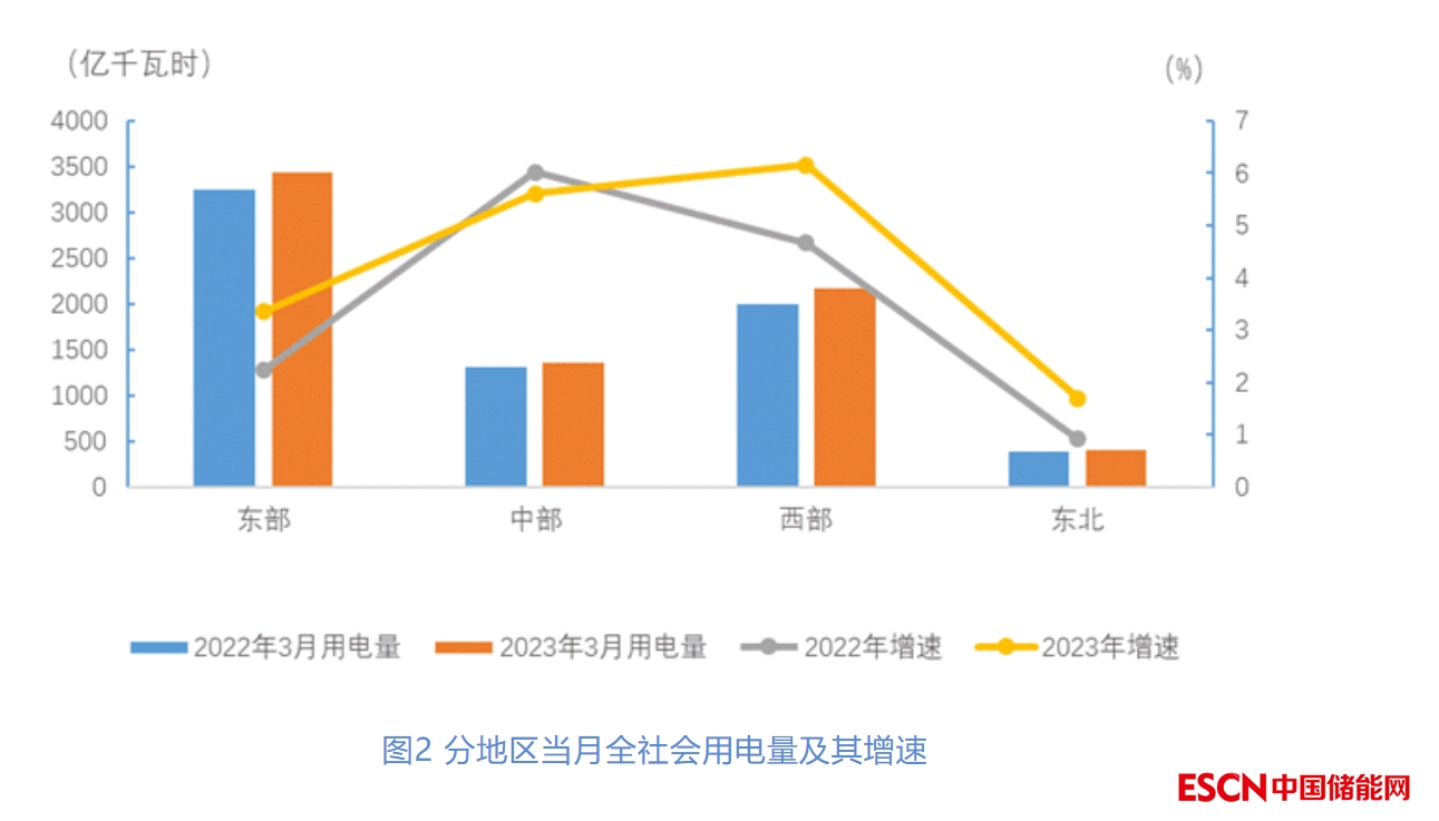 3月份,東、中、西部和東北地區(qū)全社會用電量增速分別為5.7%、4.3%、7.4%和5.4%。