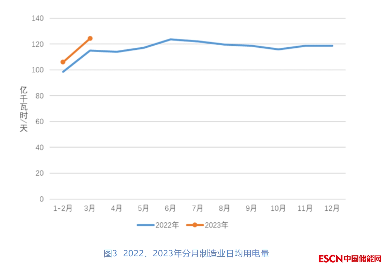 3月份,全國制造業(yè)用電量3855億千瓦時(shí),同比增長7.4%;制造業(yè)日均用電量124.4億千瓦時(shí)/天,比上年同期增加9.5億千瓦時(shí)/天,比上月增加5.3億千瓦時(shí)/天。其中,四大高載能行業(yè)用電量合計(jì)2070億千瓦時(shí),同比增長6.1%;高技術(shù)及裝備制造業(yè)用電量842億千瓦時(shí),同比增長10.8%;消費(fèi)品制造業(yè)用電量500億千瓦時(shí),同比增長5.0%;其他制造業(yè)行業(yè)用電量443億千瓦時(shí),同比增長9.4%。