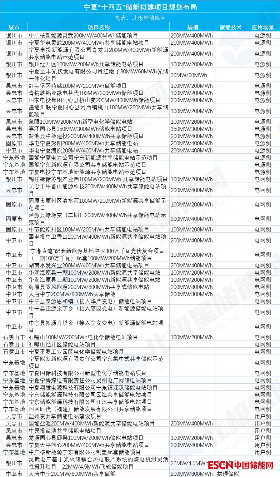 根據(jù)分區(qū)布局建議,十四五期間寧夏擬建50個電源側、電網(wǎng)側、用戶側以及物理儲能項目等各類項目,在6地市規(guī)劃的儲能規(guī)模力爭達到5.45GW。