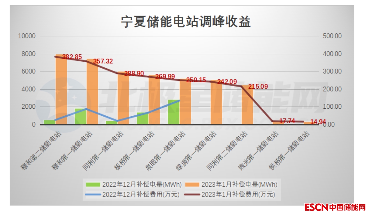 據(jù)北極星儲能網(wǎng)統(tǒng)計,自2022年12月開始,寧夏投運的儲能電站陸續(xù)開始參與西北地區(qū)電力輔助服務調峰市場,2022年12月-2023年1月兩個月內9座儲能電站累計調峰收益超過2370萬元。