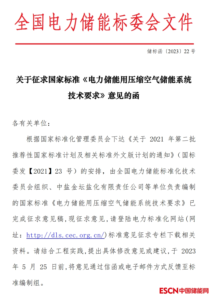 關(guān)于征求國(guó)家標(biāo)準(zhǔn)《電力儲(chǔ)能用壓縮空氣儲(chǔ)能系統(tǒng)技術(shù)要求》意見(jiàn)的函