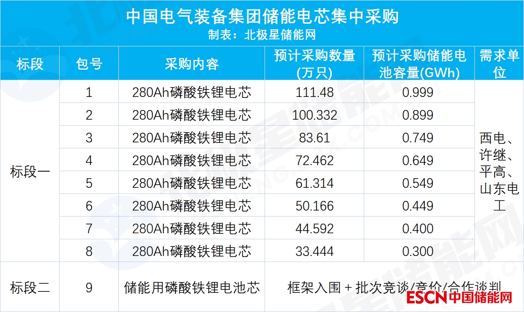 中國電氣裝備集團(tuán)發(fā)布儲(chǔ)能電芯規(guī)模集采公告,需求單位來自西電、許繼、平高、山東電工。本次采購共包含兩個(gè)標(biāo)段,其中標(biāo)段一有8個(gè)標(biāo)包,預(yù)計(jì)共采購557.4萬只280Ah磷酸鐵鋰電芯,總儲(chǔ)能電池容量預(yù)計(jì)達(dá)4.99GWh。標(biāo)段二則同樣采購儲(chǔ)能用磷酸鐵鋰電池芯、未透露具體采購規(guī)模,根據(jù)框架入圍+批次競(jìng)談/競(jìng)價(jià)/合作談判的形式確定。