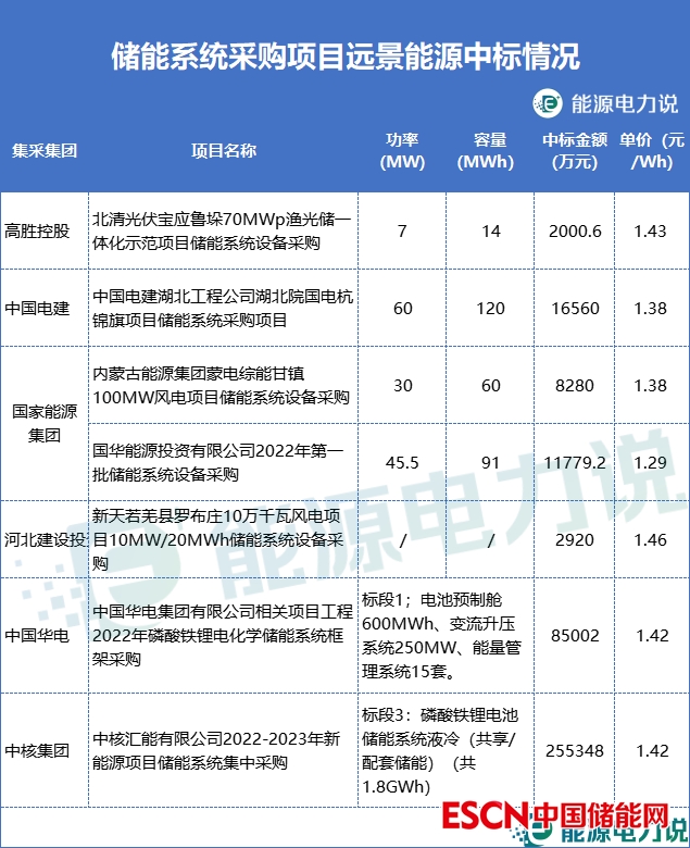 遠(yuǎn)景能源中標(biāo)了高勝控股、電建、國(guó)家能源、華電、中核集團(tuán)7個(gè)儲(chǔ)能系統(tǒng)采購(gòu)項(xiàng)目,報(bào)價(jià)在1.29-1.43元/Wh。