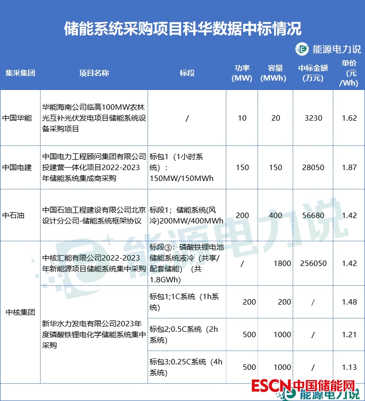 科華數(shù)據(jù)中標(biāo)了電建、華能、中石油、中核等集團(tuán)的儲(chǔ)能系統(tǒng)采購(gòu)項(xiàng)目,中標(biāo)單價(jià)在1.13-1.87元/Wh之間。
