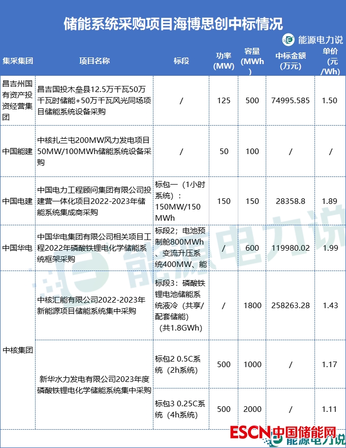 海博思創(chuàng)中標(biāo)了昌吉州國(guó)有資產(chǎn)投資經(jīng)營(yíng)集團(tuán)、電建、能建、華電、中核集團(tuán)的儲(chǔ)能系統(tǒng)采購(gòu)項(xiàng)目,中標(biāo)單價(jià)在1.11-1.89元/Wh之間。