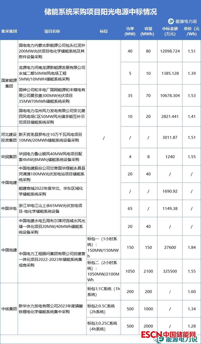 在統(tǒng)計(jì)的117個(gè)項(xiàng)目中,陽(yáng)光電源中標(biāo)了國(guó)家能源集團(tuán)、電建、華電等多個(gè)集團(tuán)采購(gòu)的儲(chǔ)能系統(tǒng)采購(gòu)項(xiàng)目,中標(biāo)單價(jià)在1.40-1.89元/Wh之間。其中,陽(yáng)光電源成功入圍新華水電2023年磷酸鐵鋰儲(chǔ)能系統(tǒng)集采3個(gè)標(biāo)段。