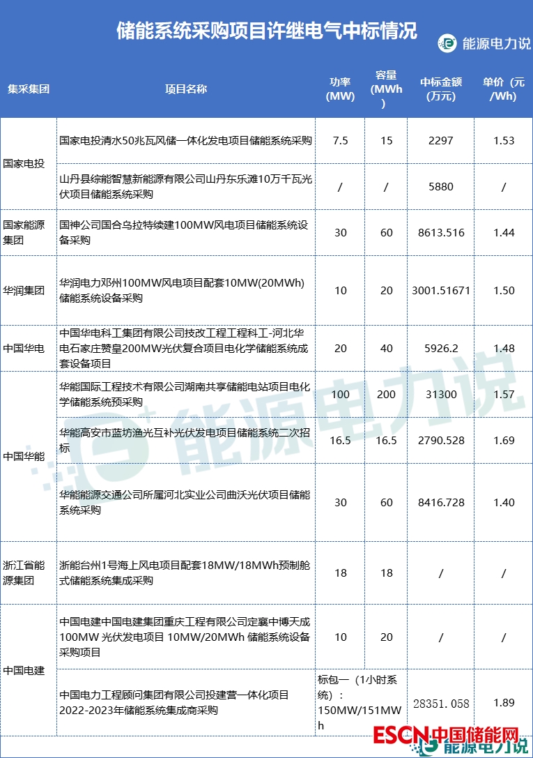 許繼電氣中標(biāo)了國(guó)家電投、國(guó)家能源集團(tuán)、華潤(rùn)、華能、電建等集團(tuán)的11個(gè)儲(chǔ)能系統(tǒng)采購(gòu)項(xiàng)目,類型涉及新能源配儲(chǔ)、共享儲(chǔ)能、儲(chǔ)能系統(tǒng)集采,中標(biāo)報(bào)價(jià)在1.40-1.89元/Wh。