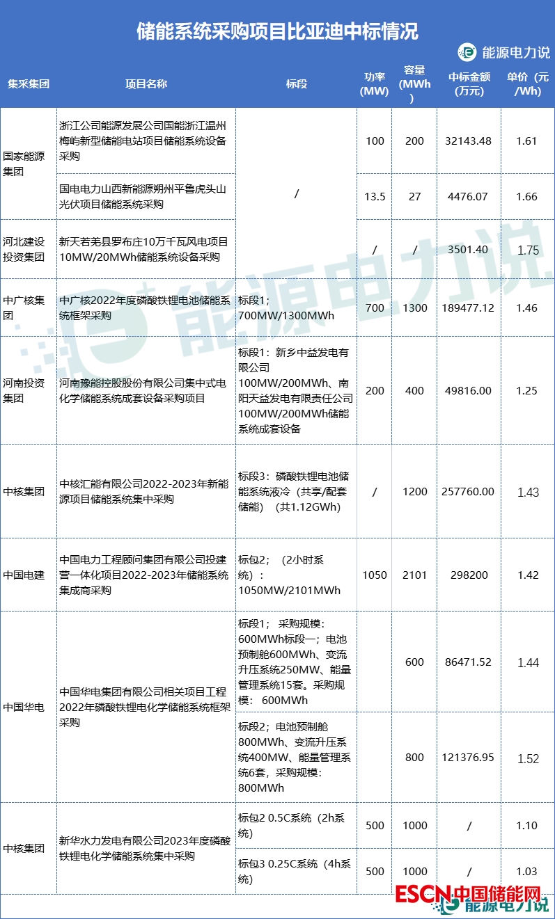 比亞迪在中國(guó)電建、國(guó)家能源集團(tuán)、中核集團(tuán)等多個(gè)集團(tuán)的儲(chǔ)能系統(tǒng)采購(gòu)項(xiàng)目中成功中標(biāo)。其中包括斬獲中廣核2022年度磷酸鐵鋰電池儲(chǔ)能系統(tǒng)集采標(biāo)段一700MW/1300MWh訂單。這些儲(chǔ)能系統(tǒng)項(xiàng)目中標(biāo)單價(jià)在1.03-1.75元/Wh之間,在新華水發(fā)電2023年度磷酸鐵鋰電化學(xué)儲(chǔ)能系統(tǒng)集采中分別入圍2h、4h系統(tǒng)標(biāo)段,中標(biāo)報(bào)價(jià)分別為1.10元/Wh、1.03元/Wh。