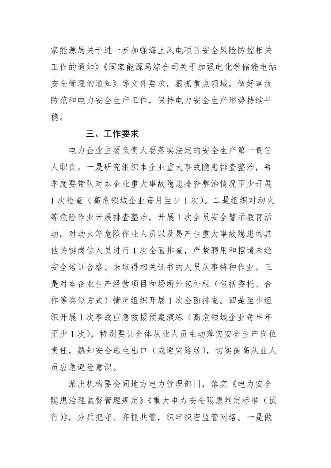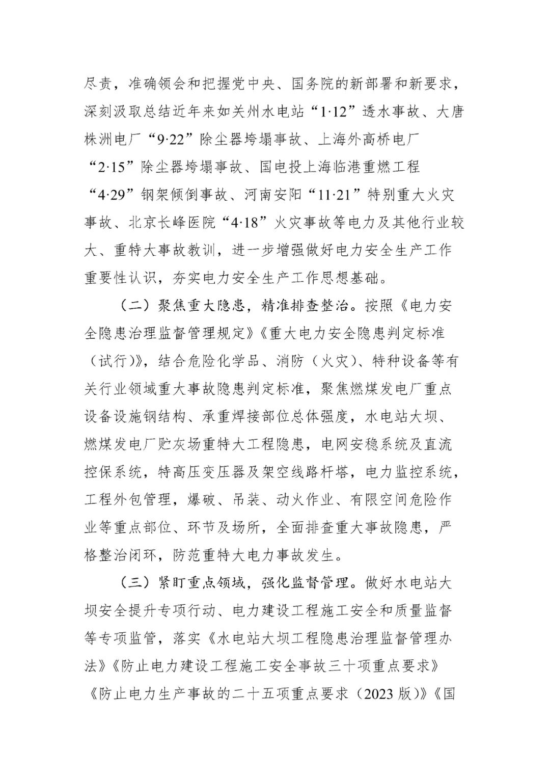 為認(rèn)真貫徹落實(shí)黨的二十大精神和習(xí)近平總書(shū)記關(guān)于安全生產(chǎn)重要論述,按照黨中央、國(guó)務(wù)院決策部署,進(jìn)一步落實(shí)國(guó)務(wù)院安全生產(chǎn)委員會(huì)全體會(huì)議有關(guān)部署,按照國(guó)務(wù)院安委會(huì)《全國(guó)重大事故隱患專項(xiàng)排查整治2023行動(dòng)總體方案》各項(xiàng)工作要求,從即日起開(kāi)展全國(guó)電力安全生產(chǎn)重大事故隱患專項(xiàng)排查整治2023行動(dòng)。現(xiàn)將方案印發(fā)給你們,請(qǐng)結(jié)合實(shí)際認(rèn)真抓好落實(shí)。