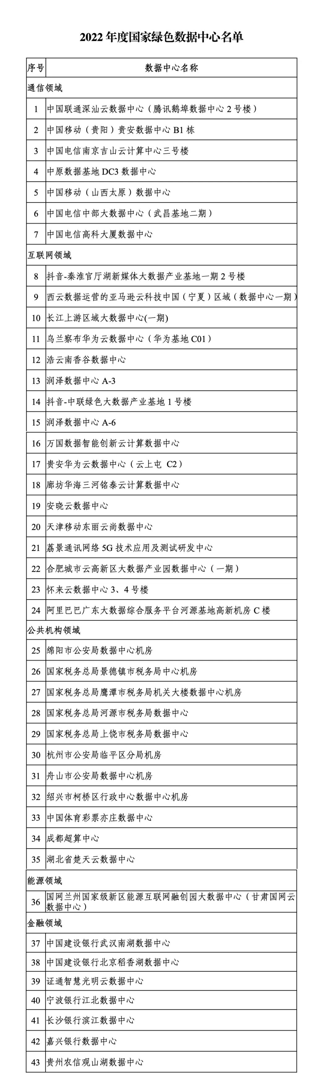為貫徹落實(shí)《“十四五”工業(yè)綠色發(fā)展規(guī)劃》,加快數(shù)據(jù)中心能效提升和綠色低碳發(fā)展,引導(dǎo)數(shù)據(jù)中心走高效、低碳、集約、循環(huán)的高質(zhì)量發(fā)展道路,助力實(shí)現(xiàn)碳達(dá)峰碳中和目標(biāo),工業(yè)和信息化部、國家發(fā)展和改革委員會(huì)、商務(wù)部、國家機(jī)關(guān)事務(wù)管理局、中國銀行保險(xiǎn)監(jiān)督管理委員會(huì)、國家能源局確定了43家2022年度國家綠色數(shù)據(jù)中心,現(xiàn)予公告。