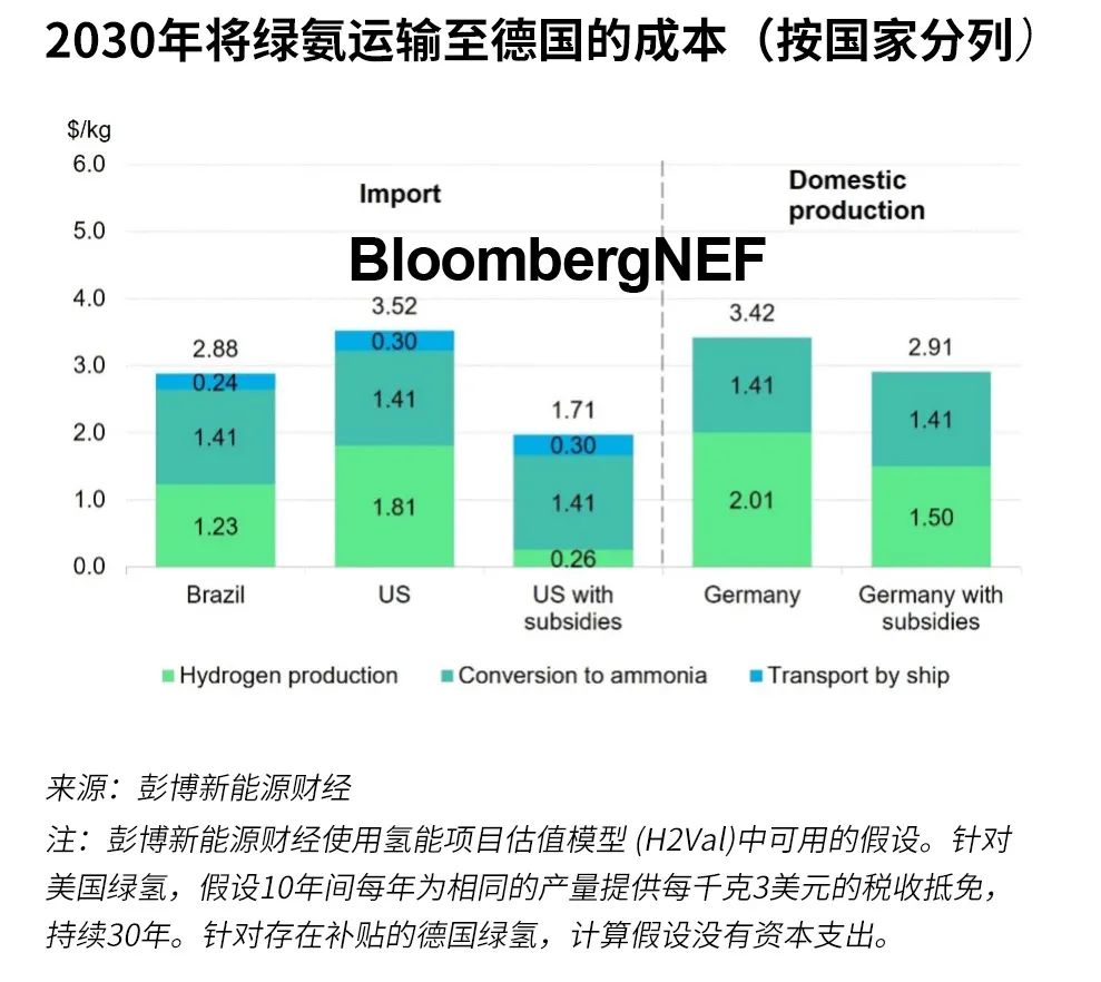 得益于預期較低的平準化制氫成本,該地區(qū)的綠氫項目可能滿足歐洲和亞洲的需求。彭博新能源財經預計,從巴西向德國出口綠氨(NH3)可能與德國的補貼產量相競爭。