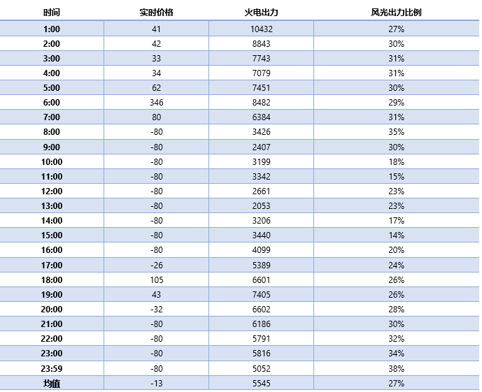對(duì)上述表格中的數(shù)據(jù)進(jìn)行分析,我們不難發(fā)現(xiàn),火電出力在13:00時(shí)到達(dá)全天最低點(diǎn),之后一路上升,但是并沒有影響負(fù)電價(jià)成為后續(xù)出清時(shí)刻的主旋律,可以合理推測(cè)負(fù)價(jià)格是由火電報(bào)價(jià)導(dǎo)致的。