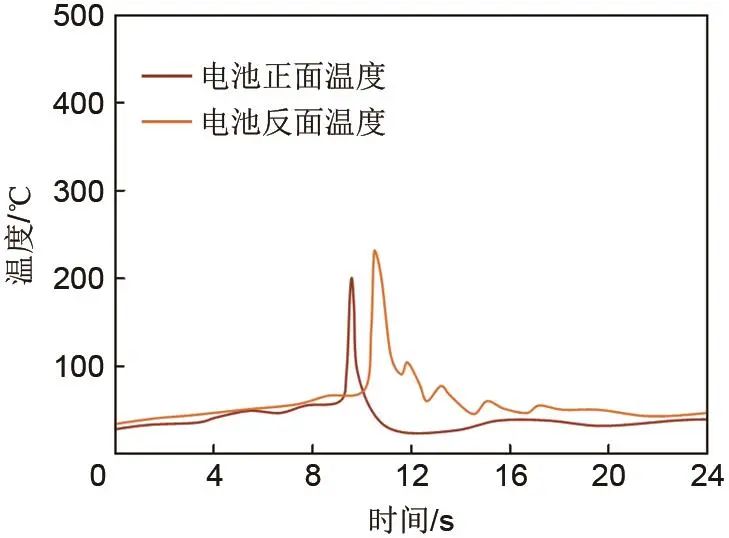圖9為熱失控電池表面溫度曲線圖??梢钥吹剑? s左右,電池表面溫度達到60 ℃左右時,電池溫度急劇上升,這是由于電池隔膜發(fā)生熔化,電池內(nèi)部正負極短路,從而放出大量熱量。滅火裝置開始啟動,釋放出全氟己酮抑制劑,在2 s內(nèi),電池溫度由200 ℃以上降到100 ℃以下,這代表電池明火能夠被迅速撲滅。除此之外,電池溫度在10 s內(nèi)降至50 ℃。