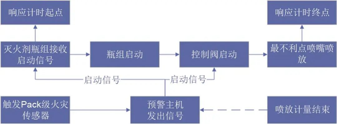 測試動作流程如圖6所示,當布置在Pack級內(nèi)的傳感器感應(yīng)到電池發(fā)生溫度異常時,由預(yù)警主機接收感應(yīng)信號并進行判定。預(yù)警主機根據(jù)所設(shè)定的程序向滅火劑瓶組和控制閥發(fā)出啟動信號,滅火劑瓶組啟動,通過主管道和分管道達到指定噴嘴位置釋放滅火劑直至明火撲滅。