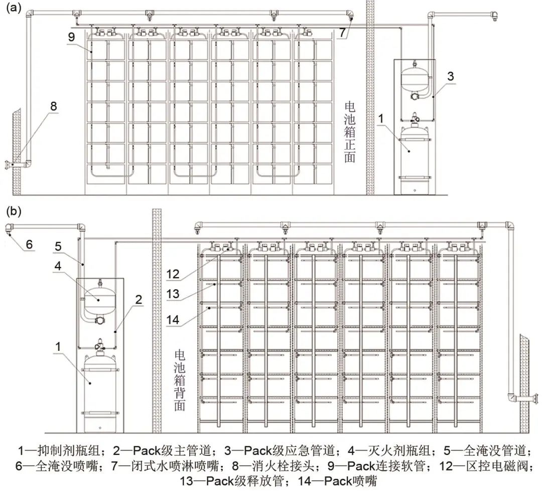 圖1 現(xiàn)有鋰離子電池儲能系統(tǒng)典型消防系統(tǒng)