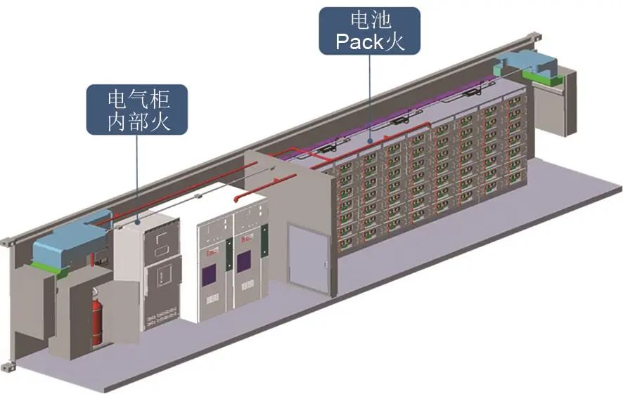 因此針對電化學(xué)儲能系統(tǒng),結(jié)合儲能系統(tǒng)結(jié)構(gòu)特點研發(fā)一種高效率且結(jié)構(gòu)和布局設(shè)計合理的滅火裝置迫在眉睫。本工作基于鋰離子電池儲能系統(tǒng)預(yù)制艙結(jié)構(gòu)特點,構(gòu)建了多層協(xié)同預(yù)警技術(shù),實現(xiàn)對電氣火災(zāi)、電池火災(zāi)的精準火災(zāi)預(yù)警。參考現(xiàn)有消防建設(shè)標準的基礎(chǔ)上,在現(xiàn)有七氟丙烷滅火系統(tǒng)基礎(chǔ)上增加鋰離子電池火災(zāi)抑制系統(tǒng),通過抑制系統(tǒng)中的Pack級釋放管道布置及時將全氟己酮滅火劑輸送至熱失控Pack,實現(xiàn)對熱失控電池的精準防控,防止電池火災(zāi)蔓延。滅火系統(tǒng)和抑制系統(tǒng)協(xié)同作戰(zhàn),發(fā)揮各自優(yōu)勢,全面保障電化學(xué)儲能系統(tǒng)安全運行。