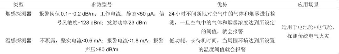 煙感探測器內(nèi)部采用離子式煙霧傳感,離子式煙霧傳感器性能遠優(yōu)于氣敏電阻類的火災(zāi)報警器。溫感探測器是利用探測器中的熱敏元件發(fā)生物理變化,響應(yīng)異常溫度、溫度速率等將溫度信號轉(zhuǎn)變?yōu)殡娦盘?,并進行報警處理。如表1所示,煙/溫感探測器具有成本低、維護簡單等優(yōu)勢,適用于探測鋰離子電池儲能系統(tǒng)中的傳統(tǒng)電氣火災(zāi)。