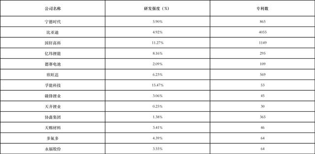 表1 “電池供應鏈”賽道企業(yè)研發(fā)強度和專利數(shù)