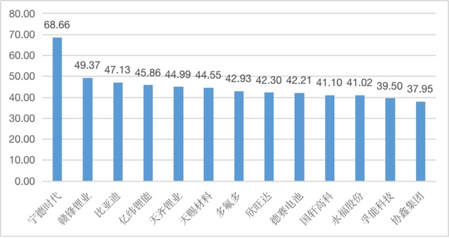圖1 “電池產業(yè)鏈”賽道企業(yè)品牌優(yōu)勢值(100分制)
