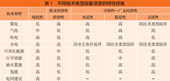 不妨將充足性、穩(wěn)定性和靈活性與市場化改革的目標(biāo)(經(jīng)濟(jì)性)和環(huán)境氣候政策的目標(biāo)(綠色性)放在一個框架下,來分析不同電源技術(shù)以及不同能源類型帶來的綜合變化(見表 1)。