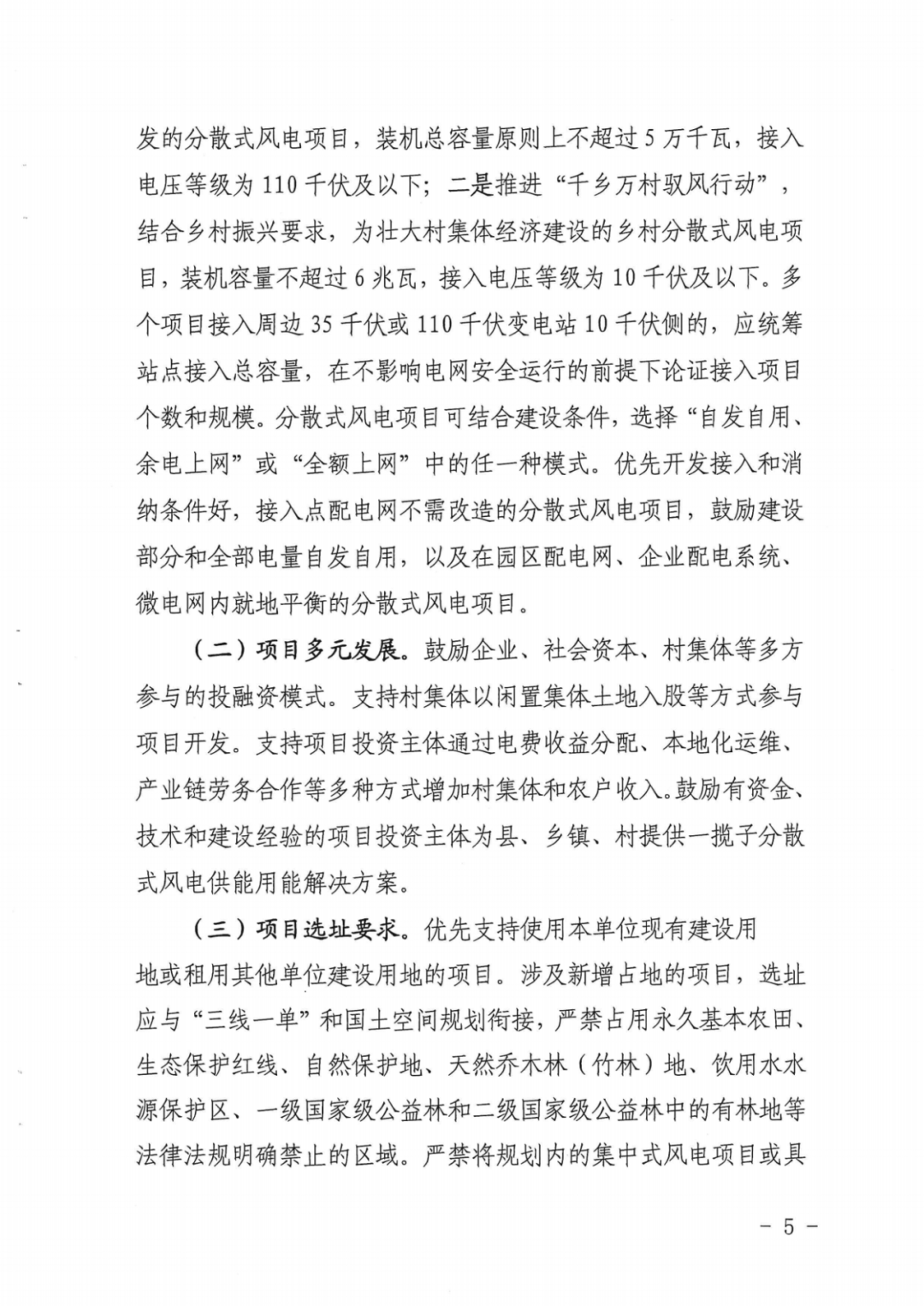 二是推進(jìn)“千鄉(xiāng)萬村馭風(fēng)行動(dòng)”結(jié)合鄉(xiāng)村振興要求,為壯大村集體經(jīng)濟(jì)建設(shè)的鄉(xiāng)村分散式風(fēng)電項(xiàng)目,裝機(jī)容量不超過6兆瓦,接入電壓等級為10千伏及以下。多個(gè)項(xiàng)目接入周邊35千伏或110千伏變電站10千伏側(cè)的,應(yīng)統(tǒng)籌站點(diǎn)接入總?cè)萘?,在不影響電網(wǎng)安全運(yùn)行的前提下論證接入項(xiàng)目個(gè)數(shù)和規(guī)模。分散式風(fēng)電項(xiàng)目可結(jié)合建設(shè)條件,選擇“自發(fā)自用余電上網(wǎng)”或“全額上網(wǎng)”中的任一種模式。優(yōu)先開發(fā)接入和消納條件好,接入點(diǎn)配電網(wǎng)不需改造的分散式風(fēng)電項(xiàng)目,鼓勵(lì)建設(shè)部分和全部電量自發(fā)自用,以及在園區(qū)配電網(wǎng)、企業(yè)配電系統(tǒng)微電網(wǎng)內(nèi)就地平衡的分散式風(fēng)電項(xiàng)目。