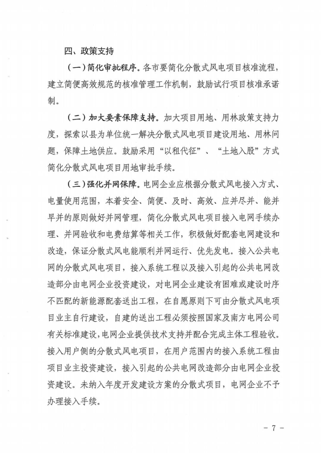 加大要素保障支持。加大項(xiàng)目用地、用林政策支持力度,探索以縣為單位統(tǒng)一解決分散式風(fēng)電項(xiàng)目建設(shè)用地、用林問題,保障土地供應(yīng)。鼓勵(lì)采用“以租代征”、“土地入股”方式簡化分散式風(fēng)電項(xiàng)目用地審批手續(xù)。