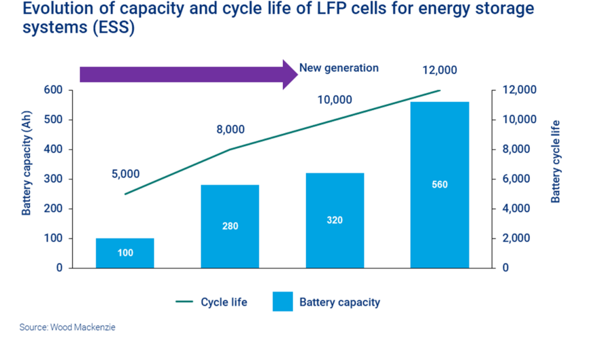 280 Ah(安培小時(shí))已經(jīng)成為 LFP 電池在電網(wǎng)規(guī)模應(yīng)用中的新標(biāo)準(zhǔn),容量高達(dá) 560 Ah,循環(huán)壽命高達(dá) 12,000 次。然而,更大的電池需要更高的制造能力,并且對(duì)安全管理也有影響。