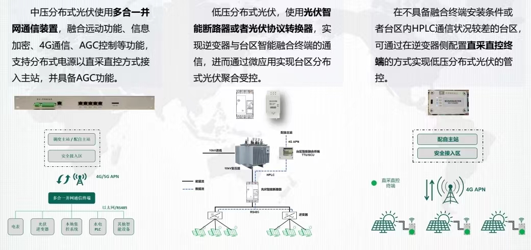 通過(guò)交易系統(tǒng)解決綠電需求,在調(diào)控聚合方面,除了管控系統(tǒng)我們也研發(fā)應(yīng)用了性?xún)r(jià)比高的各監(jiān)測(cè)控制點(diǎn)的終端裝置,在在10KV并網(wǎng)點(diǎn)和低壓區(qū)域分布式光伏聚合并網(wǎng)點(diǎn)加裝多合一并網(wǎng)終端,能夠正確接收并自動(dòng)執(zhí)行調(diào)度、配自主站下發(fā)的指令,對(duì)逆變器、PLC、本地集控系統(tǒng)等進(jìn)行調(diào)節(jié),從而實(shí)現(xiàn)AGC子站功能。