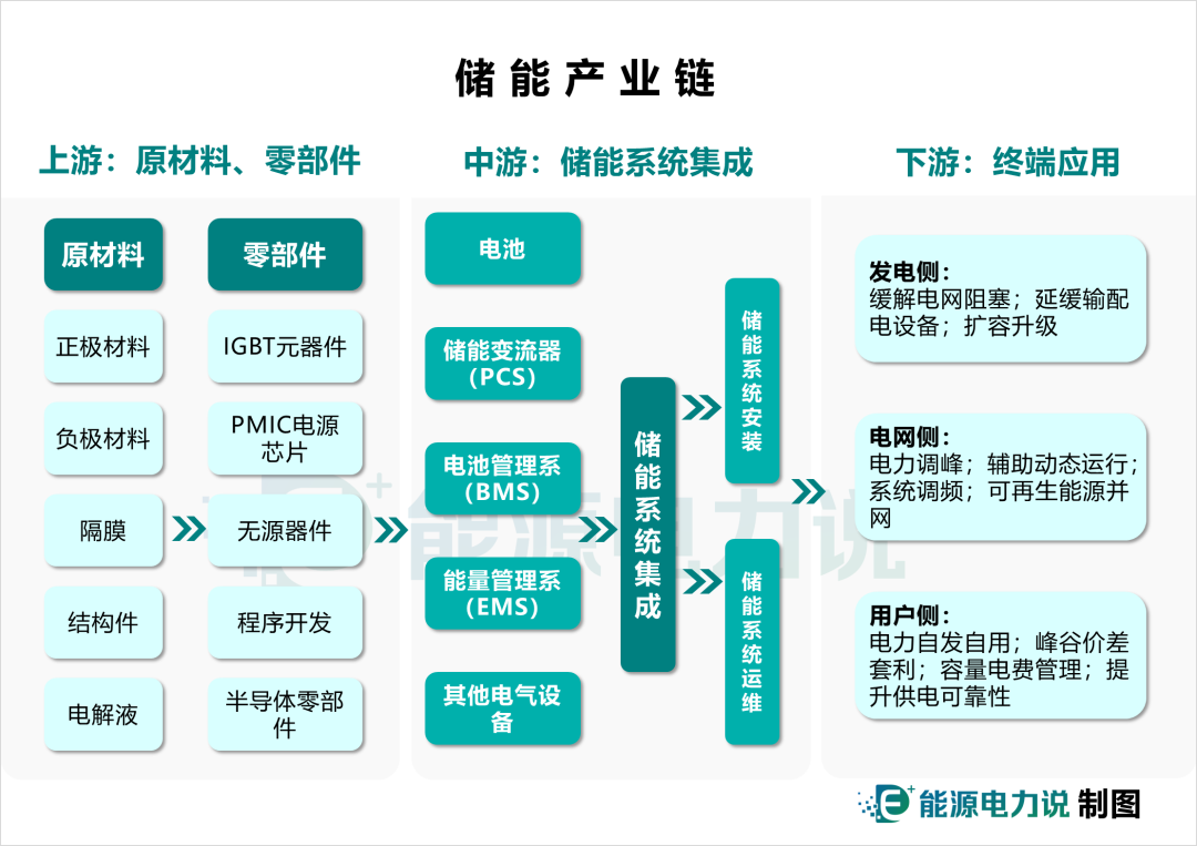 中國儲能網(wǎng)訊:從電化學(xué)儲能系統(tǒng)產(chǎn)業(yè)鏈來看,上游是電池原材料、電子元器件供應(yīng)商等;中游是儲能系統(tǒng)集成;下游應(yīng)用端則是風(fēng)光電站、電網(wǎng)系統(tǒng)、戶用/工商業(yè)、通信運營商、數(shù)據(jù)中心等終端用戶。一個典型的電化學(xué)儲能系統(tǒng)主要由電池、儲能變流器(PCS)、電池管理系統(tǒng)(BMS)、能量管理系統(tǒng)(EMS)四個核心部分構(gòu)成。
