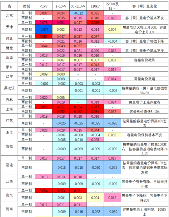 1.針對(duì)不同用戶的電價(jià)結(jié)構(gòu)更加合理。一是除個(gè)別省份對(duì)經(jīng)營(yíng)性用戶仍劃分一般工商業(yè)、大工業(yè)外,其他省級(jí)單位均按照《通知》要求,僅按照用戶用電容量劃分單一制和兩部制,體現(xiàn)了公平性原則;二是按電壓等級(jí)不同執(zhí)行不同的容(需)量電價(jià),一般電壓越高,容(需)量電價(jià)越低,合理匹配了不同電壓等級(jí)容(需)量成本差異,有利于對(duì)增量配電網(wǎng)、大用戶等高電壓等級(jí)用戶的減負(fù)。