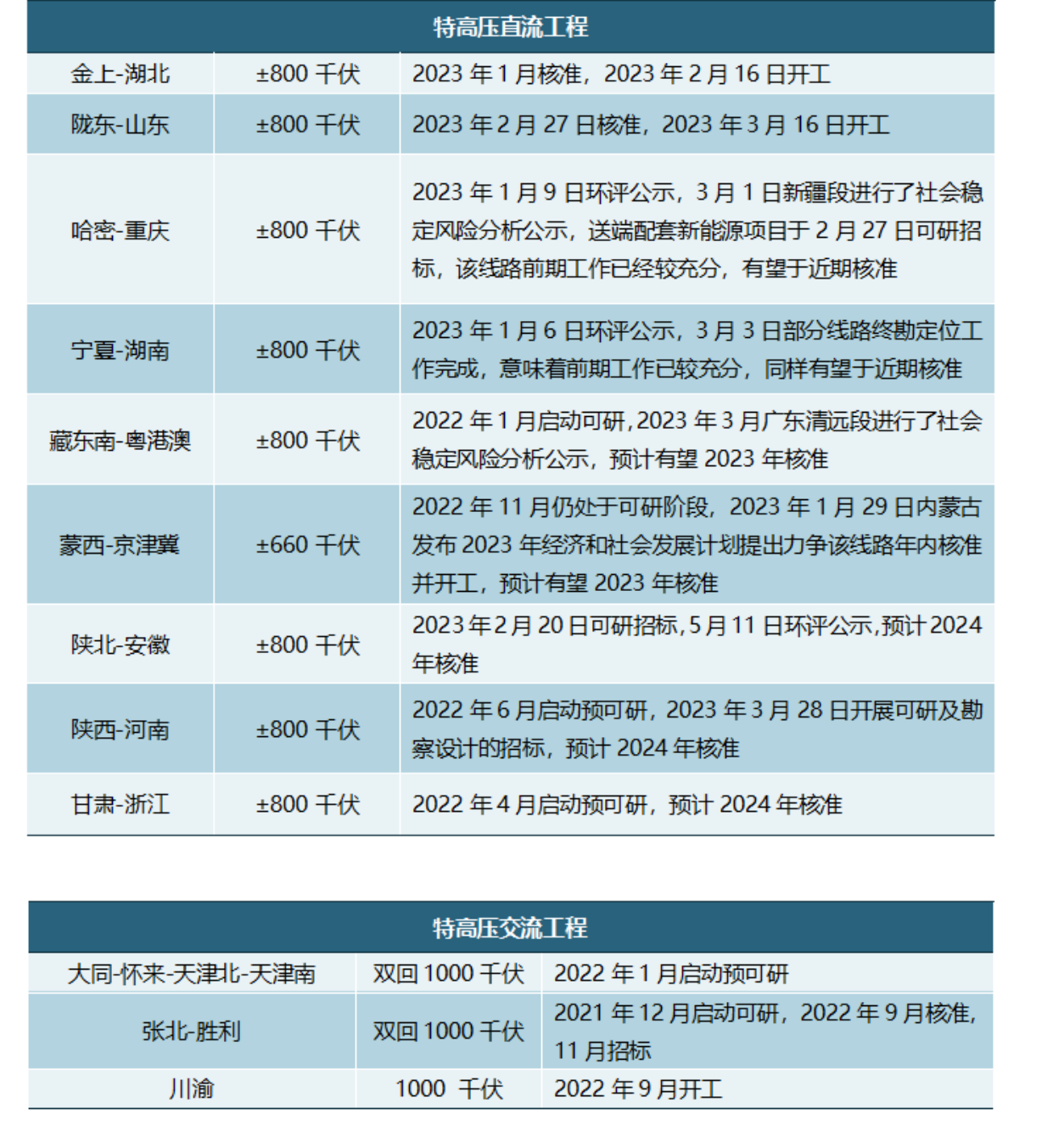進(jìn)入2023年,以沙漠、戈壁、荒漠地區(qū)為重點(diǎn)的大型風(fēng)光基地建設(shè)正在提速。隨著大型風(fēng)光基地建設(shè)提速,新能源并網(wǎng)消納以及跨區(qū)域電力輸送問(wèn)題亟待進(jìn)一步解決,特高壓有望迎來(lái)投資建設(shè)高峰。