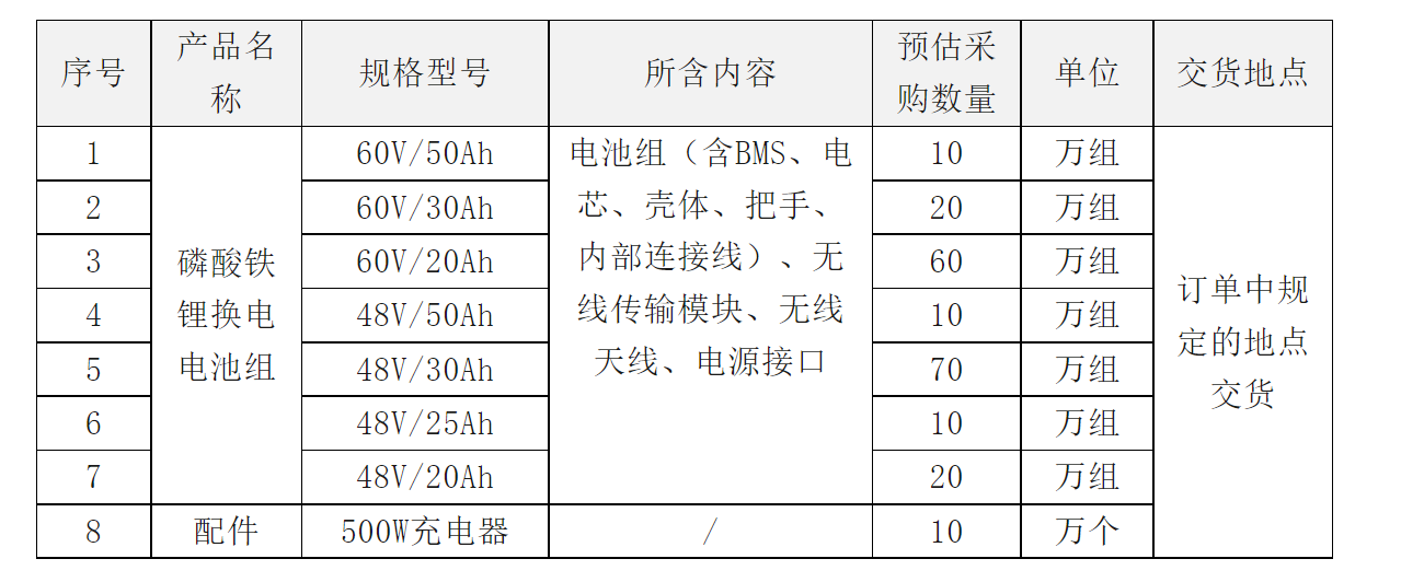 據(jù)此前招標(biāo)公告,本次集中招標(biāo)共2.94GWh磷酸鐵鋰換電電池組,500W充電器10萬個(gè)。本項(xiàng)目電池組不含稅報(bào)價(jià)單價(jià)不得高于1.283元/Wh。