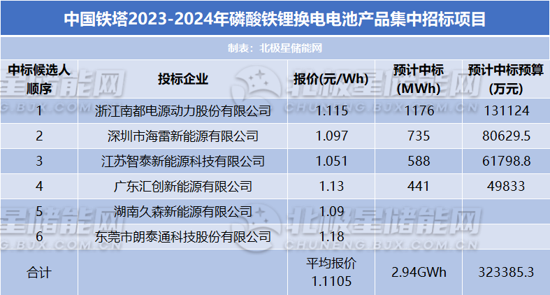 本次評(píng)選結(jié)果,6家企業(yè)報(bào)價(jià)單價(jià)平均為1.1105元/Wh,前四名中標(biāo)候選人預(yù)計(jì)將獲得中標(biāo),預(yù)計(jì)總中標(biāo)預(yù)算323,385.3萬元。