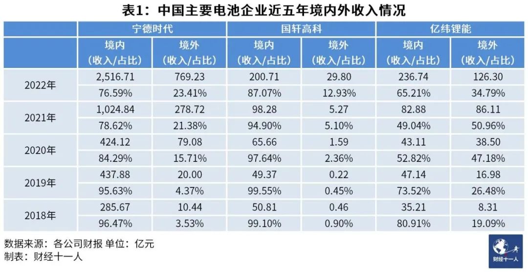 在整個鋰電池出口高速增長的背景下,中國電池企業(yè)的境外收入占比也同步進(jìn)入快車道。表1中的三家企業(yè)是境內(nèi)外收入構(gòu)成比較典型的三家中國電池企業(yè)。寧德時代是國內(nèi)為主,國外為輔;國軒高科是長期扎根國內(nèi),國際市場剛剛起步;億緯鋰能則是相對偏重境外市場。三家企業(yè)的境外收入都是從2020年開始提速,2021年進(jìn)入快車道。