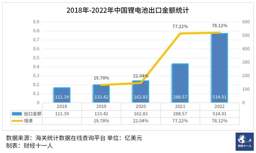 這張圖不論是數(shù)據(jù)還是設(shè)計,都體現(xiàn)出了中國在磷酸鐵鋰電池全產(chǎn)業(yè)鏈當(dāng)中擁有的統(tǒng)治優(yōu)勢。海外研究機(jī)構(gòu)和媒體之所以越來越關(guān)注中國電池產(chǎn)業(yè),原因就是中國電池從2021年開始大踏步進(jìn)入海外市場。2018年,中國鋰電池出口金額首次突破100億美元,2021年突破200億美元,2022年突破500億美元,2023年前四個月,中國鋰電池出口額213.85億美元,從2021年至今,鋰電池出口一直維持70%以上的高增速。