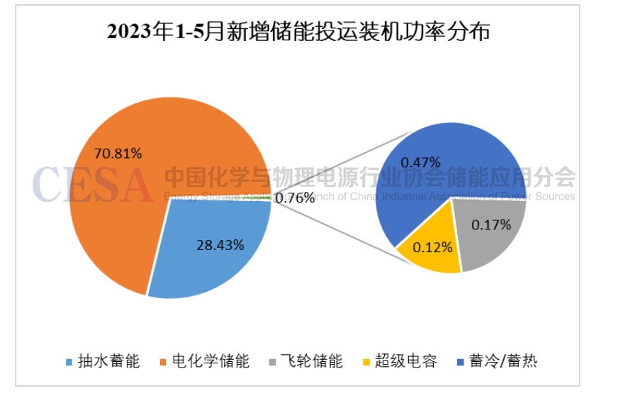 據(jù)中國化學(xué)與物理電源行業(yè)協(xié)會儲能應(yīng)用分會統(tǒng)計,2023年1-5月共有97個新型儲能項(xiàng)目(3.021GW)和4個抽水蓄能項(xiàng)目(1200MW)投運(yùn),共計4.221GW。其中電化學(xué)儲能項(xiàng)目共91個,裝機(jī)規(guī)模達(dá)3.01GW/6.41GWh;非電化學(xué)新型儲能項(xiàng)目共6個,其中飛輪儲能項(xiàng)目4個,裝機(jī)規(guī)模為7.2MW;超級電容項(xiàng)目1個,裝機(jī)規(guī)模為5MW;熔鹽儲熱項(xiàng)目1個,裝機(jī)規(guī)模為80MWh。
