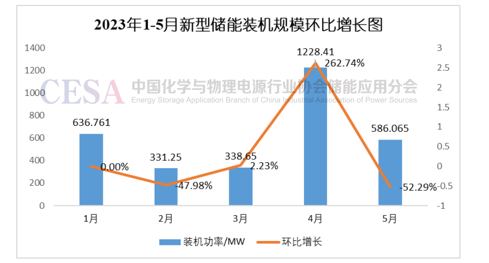 由圖2可見,2023年1-5月新型儲能裝機(jī)功率從數(shù)量上較前兩年翻倍增長,較上年同期(414.353MW)同比增長629.12%,總規(guī)模達(dá)到3.021GW。5月份裝機(jī)功率586.065MW,環(huán)比下降52.29%。