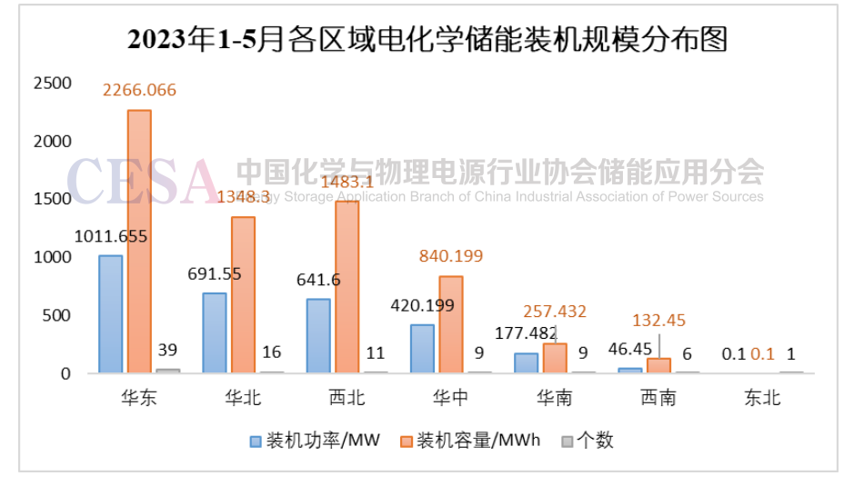 圖4 2023年1-5月各區(qū)域電化學(xué)儲能裝機(jī)規(guī)模分布圖