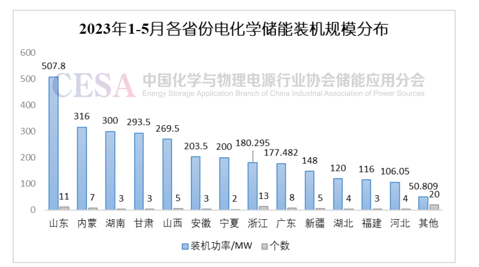 由圖5可知,2023年1-5月電化學(xué)儲能裝機(jī)規(guī)模Top5省份分別是山東、內(nèi)蒙、湖南、甘肅和山西。山東省5月新增一個百兆瓦級電化學(xué)儲能項(xiàng)目—— 華潤電力鄄城源網(wǎng)儲一體化示范項(xiàng)目,該項(xiàng)目是菏澤市首座商業(yè)化運(yùn)行的集中式共享儲能電站,也是山東省儲能示范項(xiàng)目和省重點(diǎn)項(xiàng)目,其裝機(jī)容量100MW/200MWh,包括99MW/198MWh磷酸鐵鋰電池儲能系統(tǒng)和1MW/2MWh全釩液流電池儲能系統(tǒng),項(xiàng)目投運(yùn)后,能夠進(jìn)一步提升當(dāng)?shù)仉娏ο到y(tǒng)的靈活性,可有效參與電網(wǎng)調(diào)峰、調(diào)頻,促進(jìn)電力供需平衡,為提升當(dāng)?shù)仉娋W(wǎng)新能源消納能力和電網(wǎng)安全穩(wěn)定運(yùn)行貢獻(xiàn)力量,同時也為區(qū)域后續(xù)集中儲能項(xiàng)目的建設(shè)積累了經(jīng)驗(yàn)。截至5月底,2023年山東省共新增電化學(xué)儲能裝機(jī)507.8MW,多個大型網(wǎng)側(cè)、源側(cè)電化學(xué)儲能項(xiàng)目的并網(wǎng)投運(yùn)讓山東省儲能裝機(jī)規(guī)模遙遙領(lǐng)先。湖南省和山西省5月也新增百兆瓦級電網(wǎng)側(cè)儲能電站,成功躋身電化學(xué)儲能裝機(jī)Top5省份。