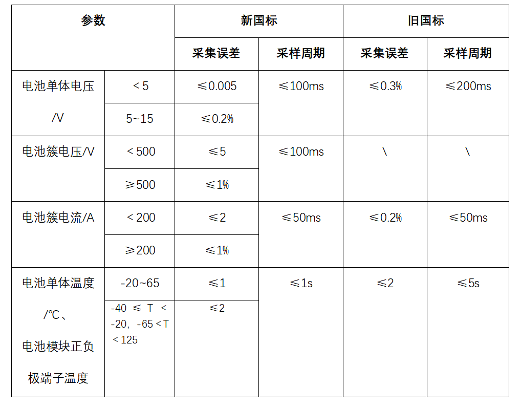 相對(duì)于舊國標(biāo),新國標(biāo)對(duì)電流、電壓、溫度的采集誤差和采樣周期進(jìn)行了“精細(xì)化”和“科學(xué)化”的規(guī)定。