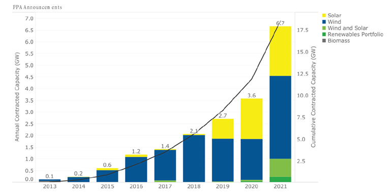 由于PPA合約具有更強(qiáng)的市場(chǎng)屬性,可能成為可再生能源發(fā)展的重要機(jī)制。截至2021年底,簽訂PPA合約的可再生發(fā)電容量約17.5GW(圖1),占比仍然很低。但根據(jù)歐洲投資銀行 (EIB) 和歐盟委員會(huì)的一項(xiàng)研究估計(jì), 到2030年P(guān)PAs 將覆蓋10%-23%的風(fēng)電和光伏容量。