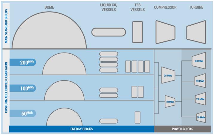 4)模塊化系統(tǒng)。二氧化碳儲(chǔ)能系統(tǒng)將是模塊化的,可以根據(jù)需要擴(kuò)展到任何尺寸。液態(tài)二氧化碳容器、壓縮機(jī)、渦輪機(jī)均有不同尺寸,使用者可以根據(jù)需要,以最合適的充電或放電率來(lái)優(yōu)化設(shè)計(jì)。