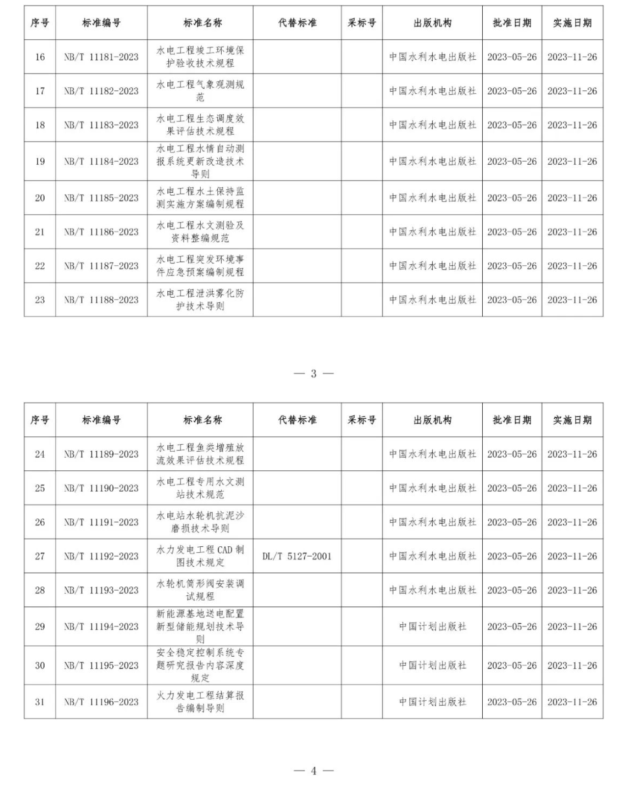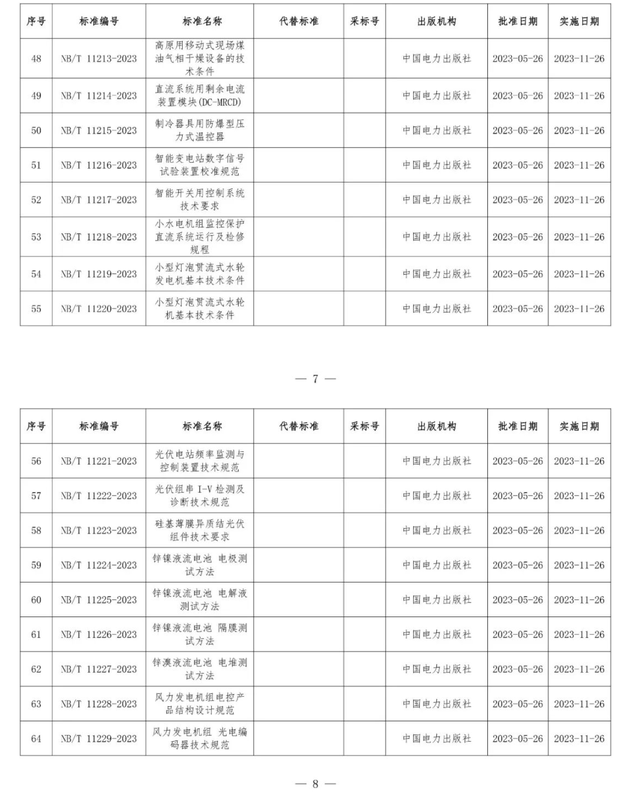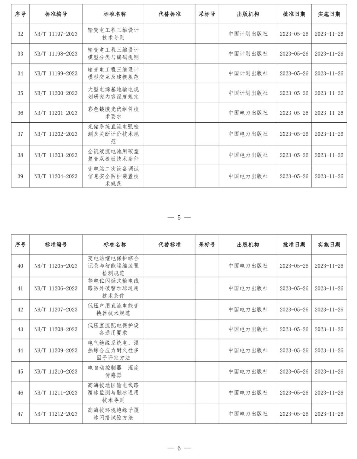 根據(jù)《中華人民共和國標準化法》《能源標準化管理辦法》,國家能源局批準《新能源基地送電配置新型儲能規(guī)劃技術導則》等310項能源行業(yè)標準(附件1)、《Code for Seismic Design of Hydropower Projects》等19項能源行業(yè)標準外文版(附件2),現(xiàn)予以發(fā)布。