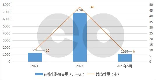 圖2:2021年1月—2023年5月全國已核準的抽水蓄能電站裝機容量和數(shù)量