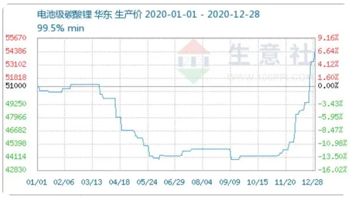 然而,去年的鋰價卻一度“飆瘋了”。去年11月7日,無錫電子盤國內(nèi)電池級碳酸鋰現(xiàn)貨平均價格為61.5萬元/噸,同日,上海有色網(wǎng)的電池級碳酸鋰平均價格為56.35萬元/噸。