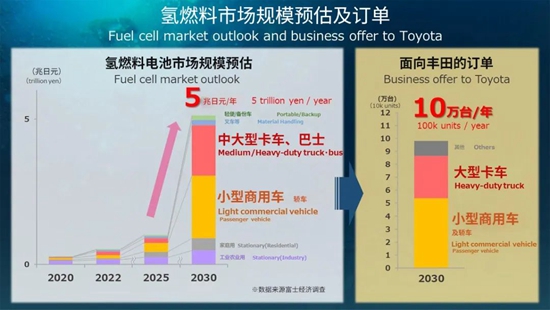 基于這一判斷,豐田將使用MIRAI的氫能部件,推進(jìn)燃料電池的對(duì)外銷(xiāo)售,在2030年預(yù)計(jì)達(dá)到10萬(wàn)輛的外銷(xiāo)訂單規(guī)模,而氫燃料電池市場(chǎng)將以商用車(chē)為中心實(shí)現(xiàn)增長(zhǎng)。