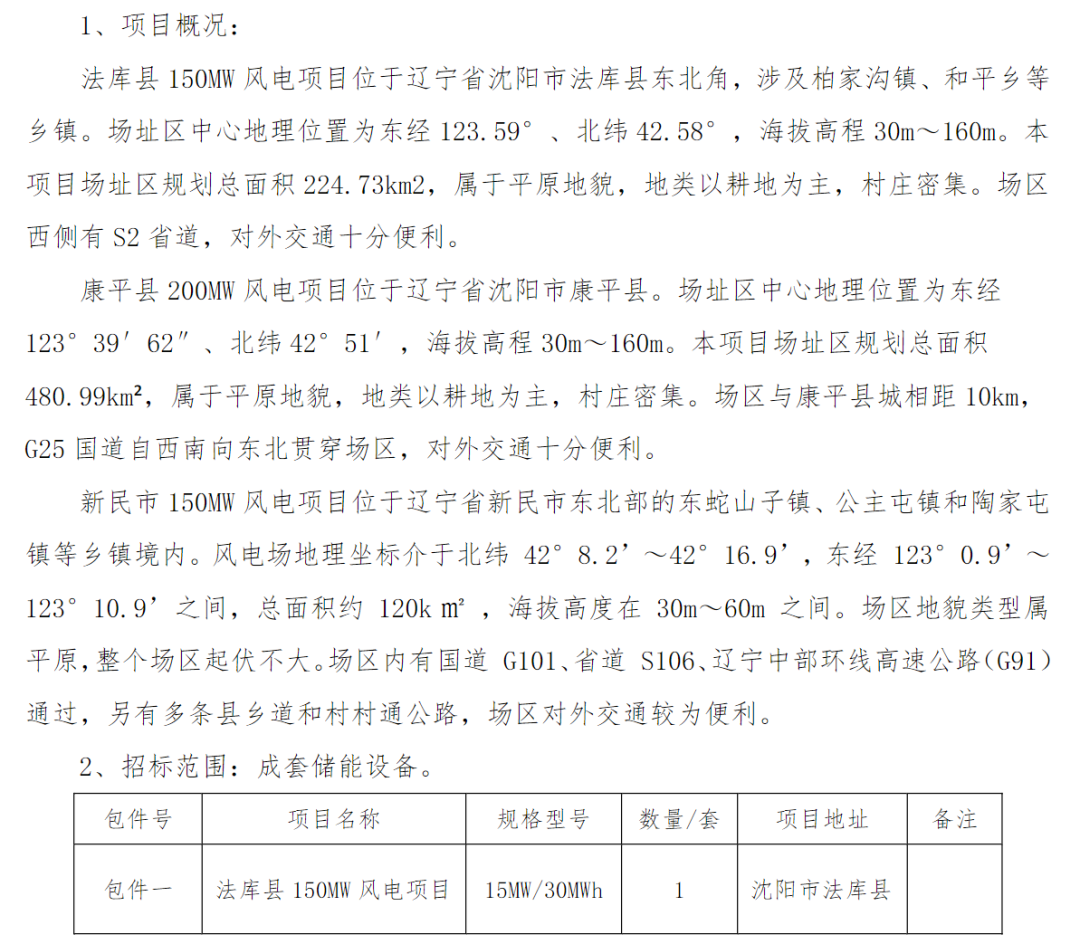 法庫(kù)縣150MW風(fēng)電項(xiàng)目配建儲(chǔ)能15MW/30MWh