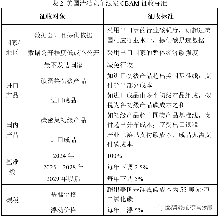 為此,美國《清潔競爭法案》跳出思維定式,直接以美國相應(yīng)產(chǎn)品的平均碳含量為衡量基準,采用弱化碳成本量化的形式簡化全國性碳稅的復(fù)雜進程,以最低成本、最快時間構(gòu)建起CBAM體系,并逐步受到兩黨支持,美國版碳關(guān)稅也正式提上議程。